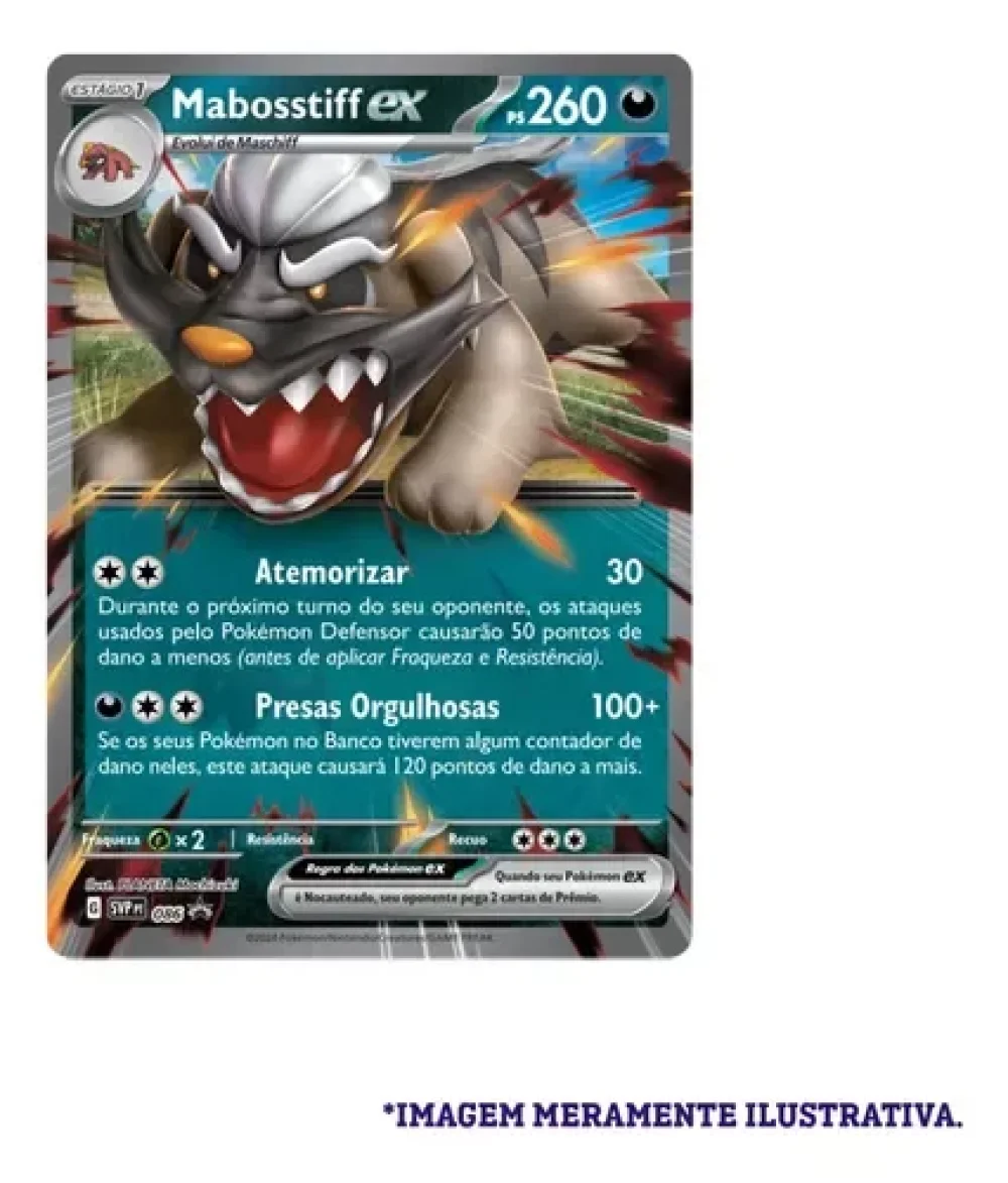 Mabosstiff normalmente é gentil, mas adota uma postura ameaçadora ao proteger seus aliados! Junte forças com esse Pokémon leal e desfira golpes aterrorizantes em seus oponentes. Nesta coleção, você encontrará Mabosstiff ex como uma carta holográfica promocional jogável e outra versão em formato extragrande, além do Maschiff, o Pokémon Traiçoeiro.