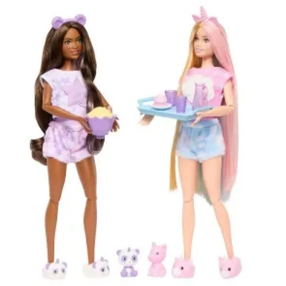 A Cozy Cute Tees Slumber Party apresenta duas bonecas Barbie ´Malibu´ e Barbie ´Brooklyn´ Cutie Reveal, dois animais de estimação e muita diversão na festa do pijama. Revele os bonecos removendo as cabeças de unicórnio e panda de pelúcia e descubra seu visual completo sob os sacos de dormir.