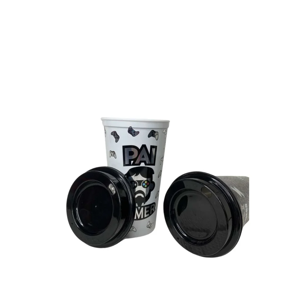 - O copo (individualmente) possui capacidade de 500 ml e tampa bico (pequena abertura para saída do líquido).