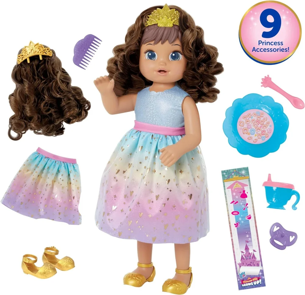 Esta boneca de 45 cm vem com mais de 75 sons e frases. Esta boneca Baby Alive tem 37 cm inicialmente e cresce lentamente quando as crianças usam seus acessórios como chupeta, copo com canudinho e tigela com colher. A boneca irá crescer lentamente com as brincadeiras e ao se alimentar. A boneca irá dizer uma frase ao se transformar em uma princesa. As crianças a partir dos 3 anos podem colocar a tiara na cabeça da boneca e criar penteados. A transformação estará completa com a linda saia brilhante de princesa. A boneca pode alternar entre os modos Bebê (37 cm) e Princesa (45 cm) mais rápido ao pressionar o botão de crescimento nas costas. Presente incrível de aniversário ou outras celebrações.