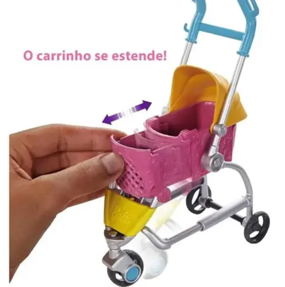 Existem duas formas de viajar: acomodar um cachorrinho no carrinho e outro na bolsa da boneca Barbie; ou puxe a frente do carrinho para fora, dobrando seu espaço para dar lugar aos dois cachorrinhos!