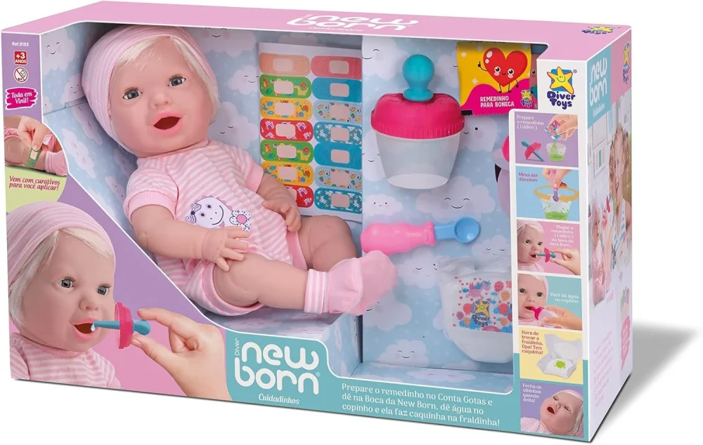 Uma linda Boneca que vai encantar qualquer criança! A New Born Cuidadinhos vem com muitos acessórios para cuidar do bebê. As meninas vão amar essa boneca e cuidar com muito carinho! Prepare o remedinho no Conta Gotas e dê na Boca da New Born, dê água no copinho e ela faz caquinha na fraldinha, acompanha ainda mamadeira, adesivos curativos, certidão de nascimento e fecha os olhinhos ao deitar!