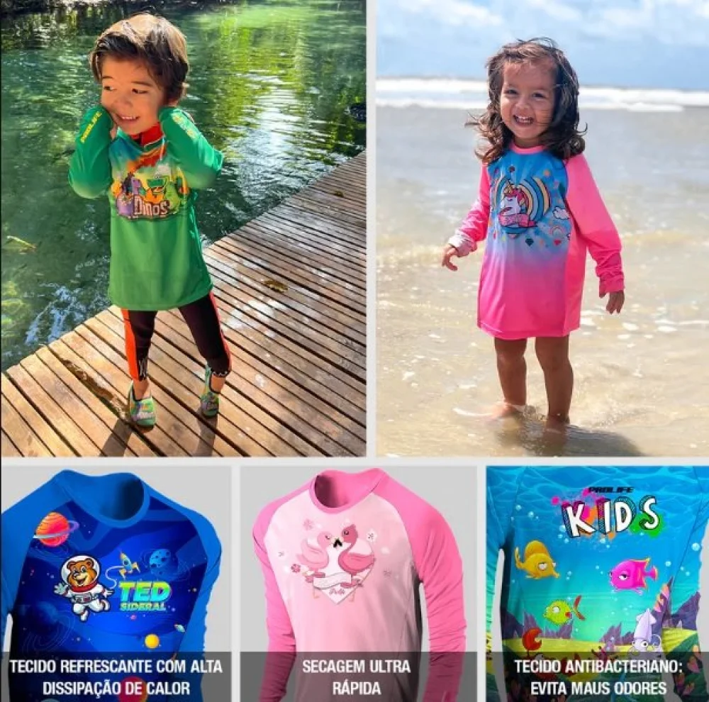 Então de que forma proteger as crianças? Apresentamos a Camisa UV Infantil da Prolife, testada e certificada em laboratório com a classificação UV50+ (a mais alta proteção solar existente). E o melhor de tudo: essa proteção nunca acaba, ela é infinita, infinita mesmo, porque a proteção solar está aplicada no tecido!