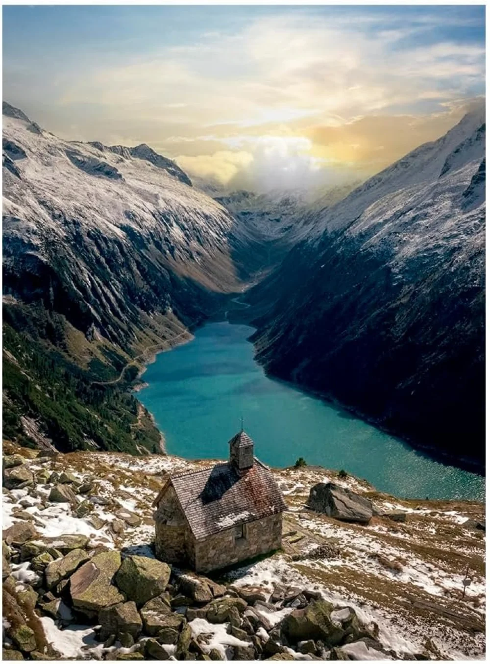 É isso que vemos na imagem que retrata este enorme vale nos Alpes, com uma construção ímpar, que se acomoda de forma plácida e isolada na magnitude das montanhas.