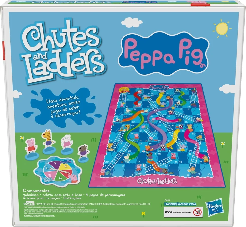 Inspirado nos personagens da famosa série Peppa Pig, o jogo envolve subir e descer escorregadores e escadas. É uma ótima opção para crianças que ainda não aprenderam a ler. Os números no tabuleiro são uma oportunidade perfeita para praticar os numerais. É um jogo de tabuleiro rápido para brincar em família ou com amigos. O objetivo é ser o primeiro jogador a chegar ao final do tabuleiro, passando por obstáculos e respondendo perguntas. Com um tabuleiro colorido e divertido, as crianças aprenderão de forma lúdica e interativa, enquanto se divertem com seus personagens favoritos. O jogo inclui as peças de personagens como Peppa, Peppa Pig, Gerald Girafa, Susie Ovelha, Danny Cão e muitos mais, ajudando a recriar as aventuras da série. É um jogo de tabuleiro que irá proporcionar muitas horas de diversão em casa ou em viagens!