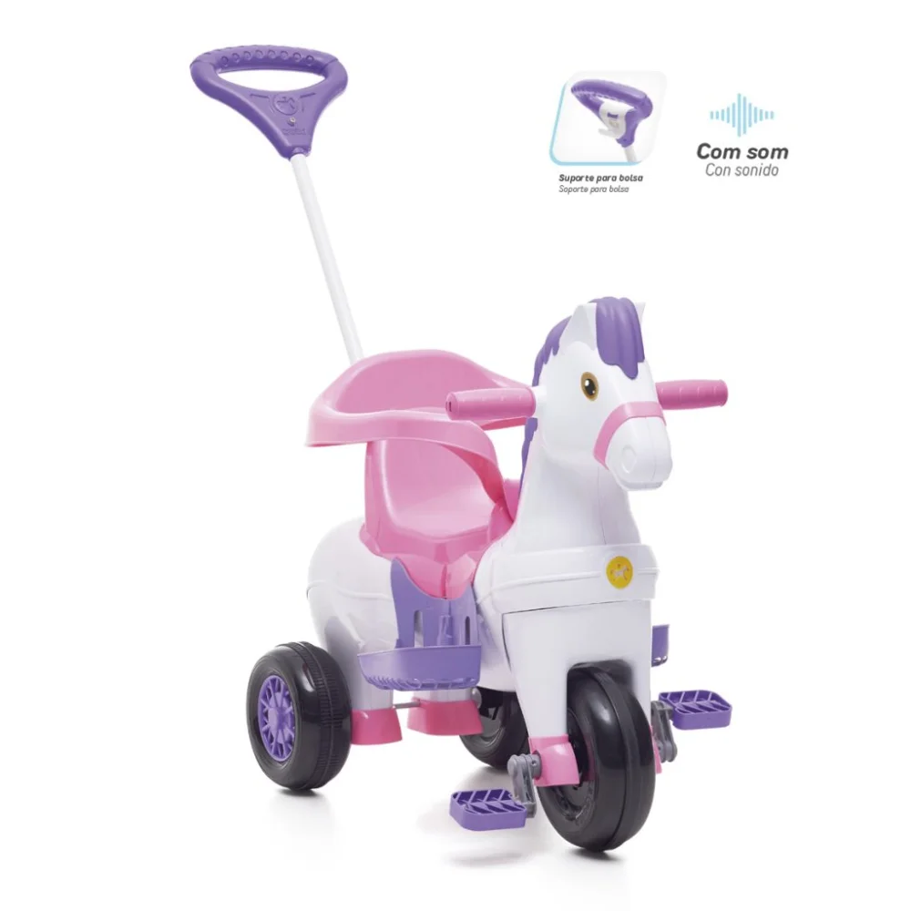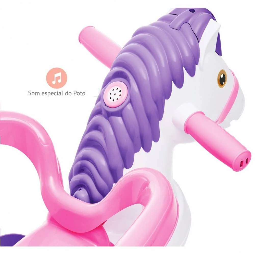 Imita som de cavalo! O cavalinho é um brinquedo 2 em 1, acompanha as fases de crescimento da criança com conforto e segurança. Na primeira fase, o apoio de pés mantém as perninhas do bebê apoiadas e, a estabilidade do corpo é garantida pelo cercado de proteção, também removível. Já na fase mais independente do bebê, retira-se o apoio de pés e cercado de proteção para a diversão do passeio pedal. Pensando nessa independência para a diversão do pedal, o Potó foi projetado com roda dianteira acompanhada de borracha para evitar derrapar.